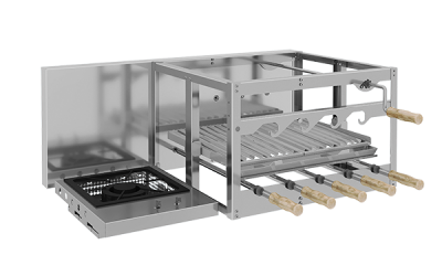 Churrasqueira rotativa com grelha automatizada, com parrilla de elevação manual e bifeteira